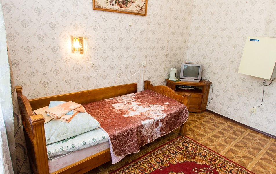 Оснащение номера: вешалка, зеркало, кровать односпальная: (80*195), прикроватная тумбочка, стул, шкаф, набор посуды, телевизор, холодильник, чайный набор посуды, электрочайник