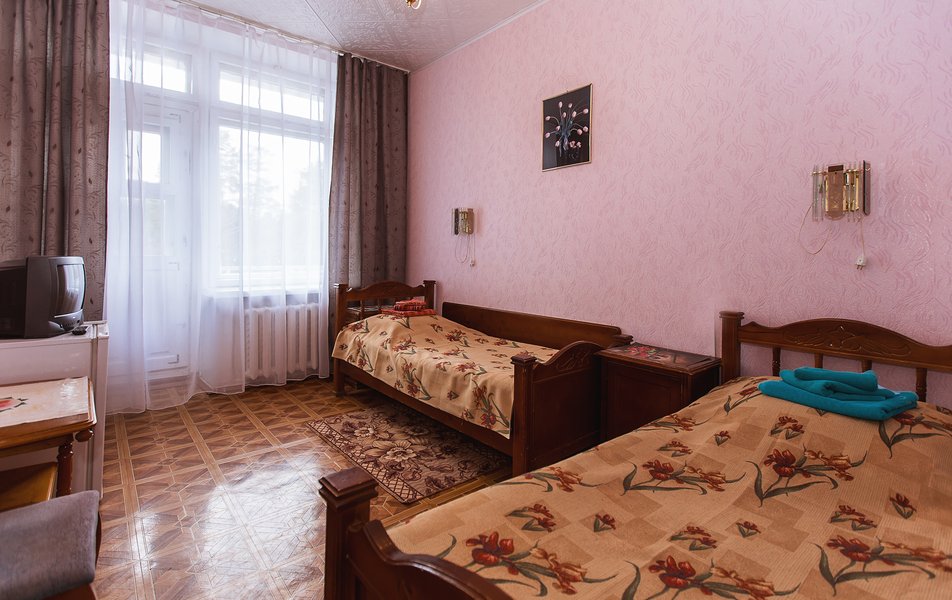 Оснащение номера: зеркало, кровати односпальные: (80*195), прикроватная тумбочка, стул, шкаф, набор посуды, телевизор, холодильник