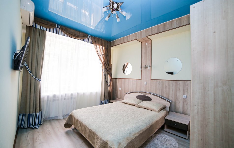 Оснащение номера: вешалка, зеркало, кровать двуспальная, кресла, прикроватная тумбочка, шкаф, набор посуды, телевизор, холодильник, электрочайник, кондиционер