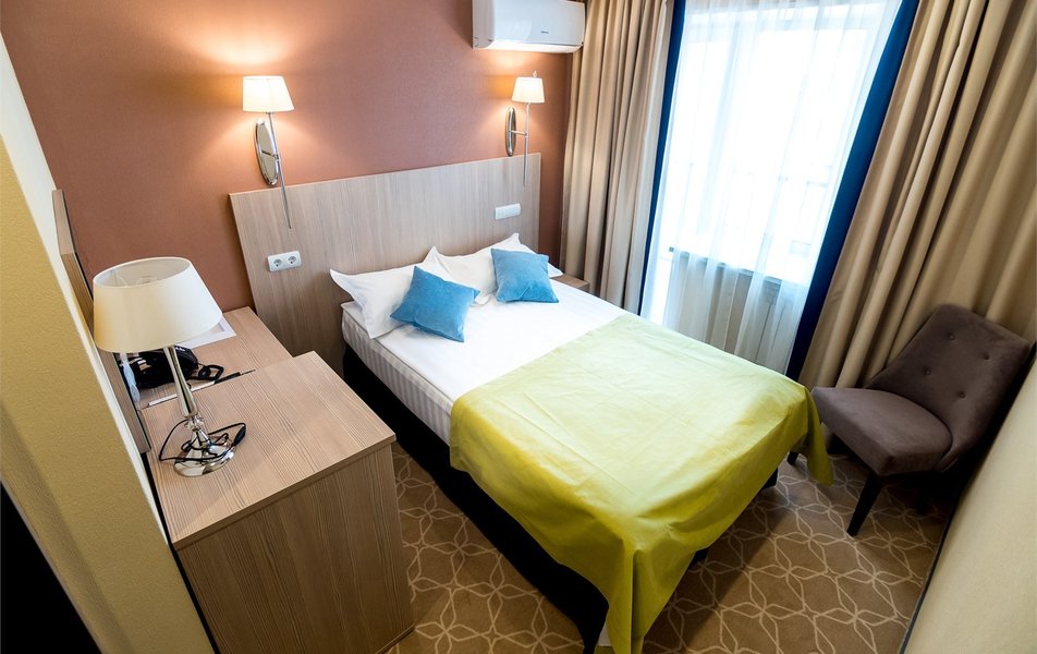 Оснащение номера: вешалка, зеркало, кровати односпальные, прикроватные тумбочки, стол, стулья, шкаф, кондиционер, мини-холодильник, телевизор, телефон, чайник